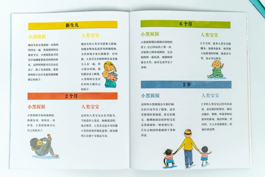 后面还对比了小黑猩猩和人类宝宝的成长,让孩子对生命的诞生和爸爸妈妈们的悉心哺育有更深一步的体会。