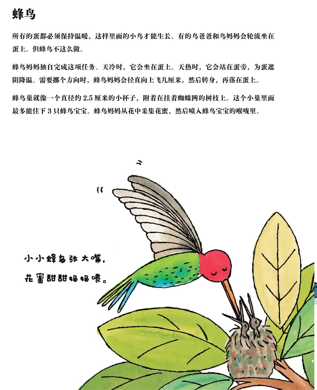 像蜂鸟,好似辛苦的单亲妈妈,孵蛋、喂食全靠自己。