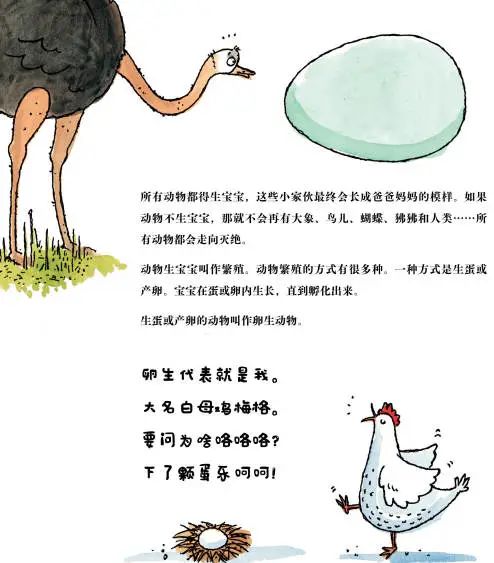 《让大象下蛋?!》里,还巧妙地通过比喻、拟人等手法,将动物繁殖、养育宝宝的方式和过程描述得妙趣横生。