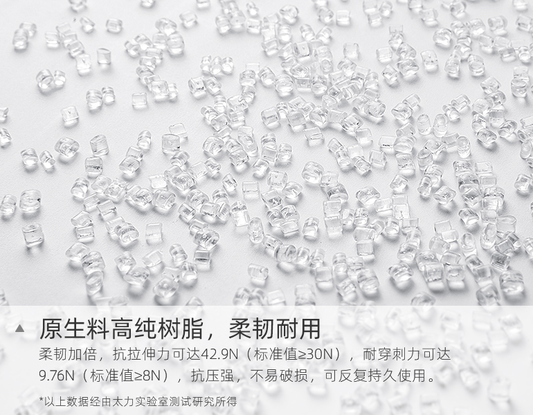 抗撕裂破裂、柔韧加倍,抗拉伸力可达42.9N(标准值≥30N),耐穿刺力可达9.76N(标准值≥8N)抗压强,不易破损,可反复持久使用。