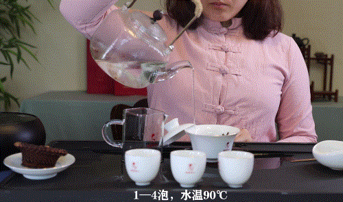 1—4泡,水温90℃,采用高冲旋转注水,(若所泡的茶块较紧可以闷泡20秒左右再出汤;若茶块松紧适度,则即入即出,无需闷泡。)