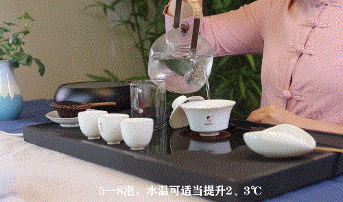 从第5泡开始,每泡可在前一泡的基础上加闷5—10秒,如第五泡闷泡5秒,则第6泡可闷泡10秒或者15秒。这一段增加水温和闷泡,是为了使茶汤的滋味保持平衡,不会忽浓忽淡。
