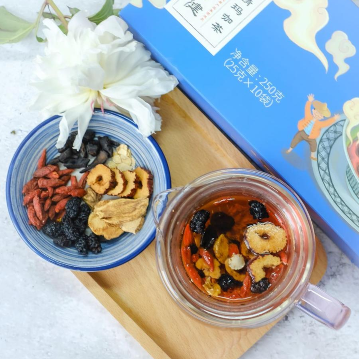 桑椹滋阴补血,生津润燥;枸杞子滋补肝肾,益精明目;覆盆子益肾固精,养肝明目;黑芝麻补肝肾,益精血,润肠燥;黄精补气养阴,健脾,润肺,益肾;牡蛎重镇安神,潜阳补阴;芡实益肾固精,补脾止泻,除湿止带。