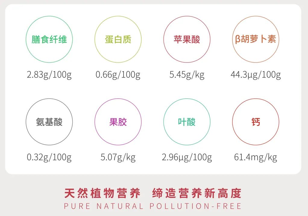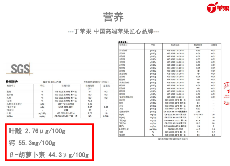 检测报告中,肉眼可见的维生素C,铁,镁和磷、叶酸、钙、胡萝卜素的含量都比普通苹果高。