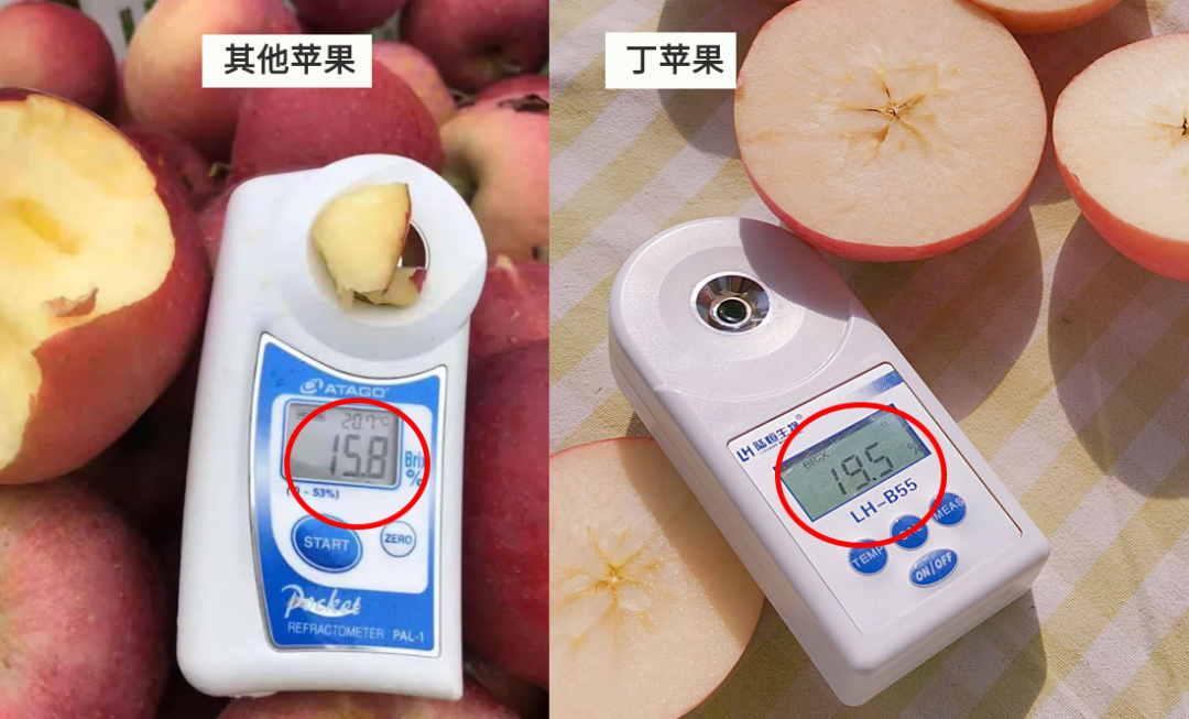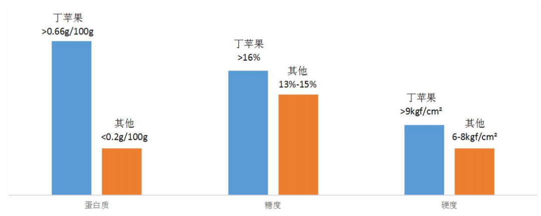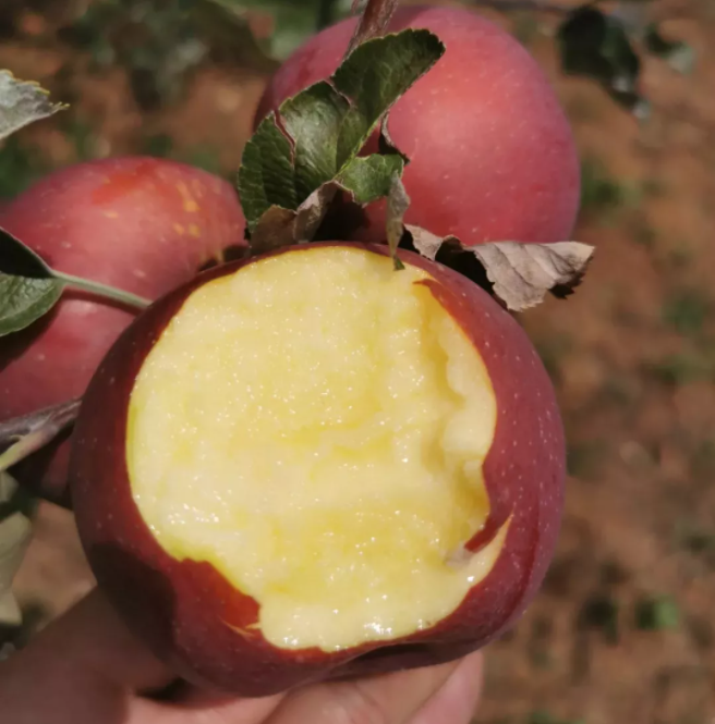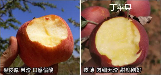 和其它苹果相比,丁苹果果肉黄白色,汁多、味甜无渣口感,绝对比得过其它苹果。