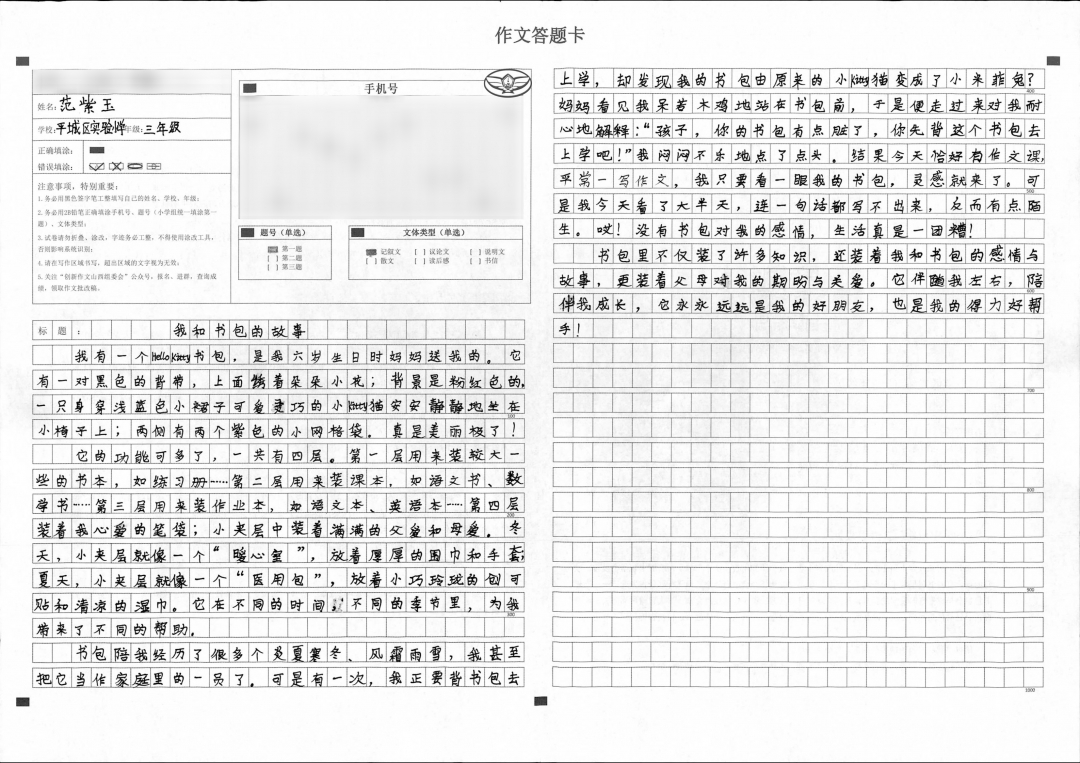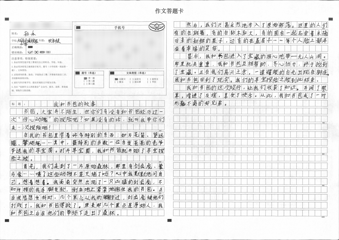 本篇文章构思奇特、想象丰富、语言流畅。全文取材新颖,创造性地把与小书包的故事和冒险结合起来,通过生动、惊险、有趣的故事描写,给人一种奇幻之感。孩子平时想象力就很丰富,希望在之后的写作中可以将这个特点继续保持下去,再接再厉。