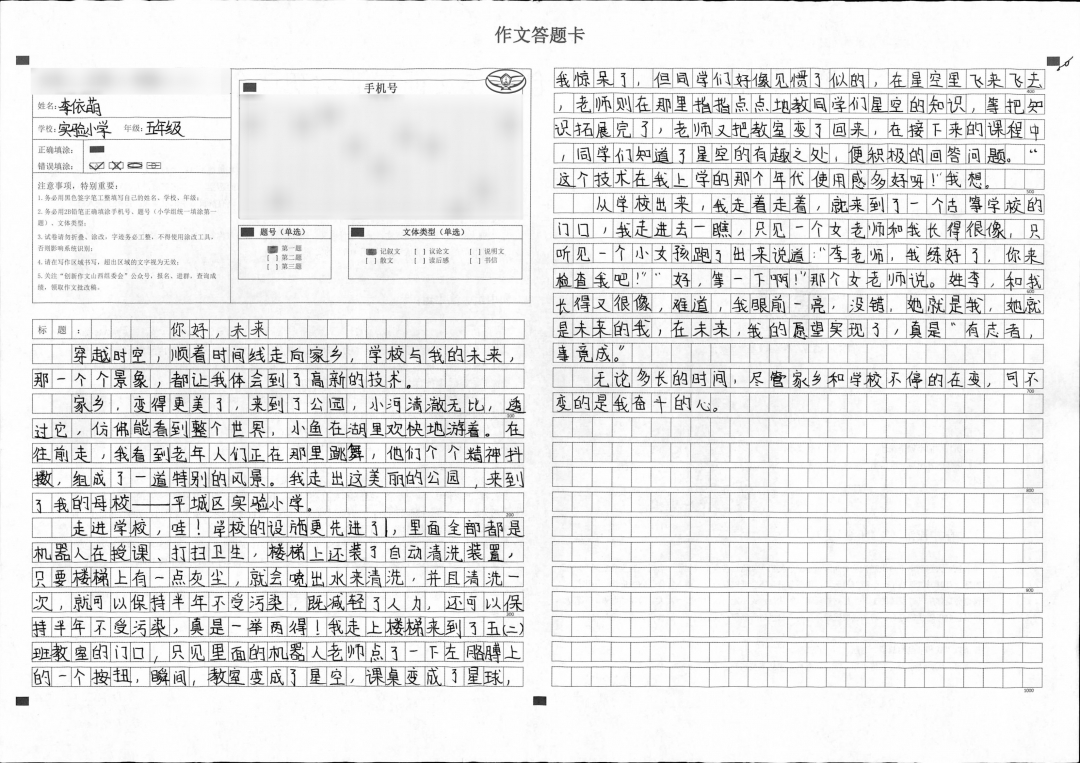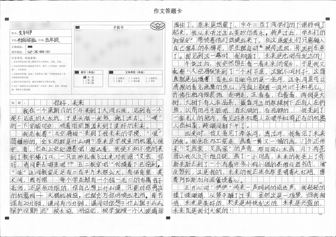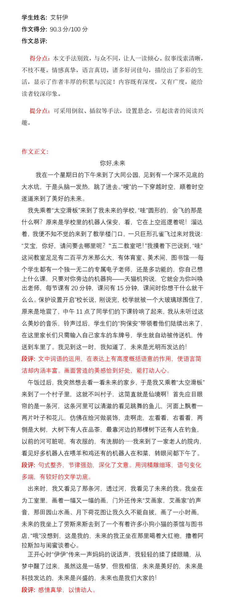 文章能紧扣题目要求,结构严谨重点突出。用自己丰富的想象力运用拟人比喻等手法让文章生动活泼。未来是美的,本文的语言同样优美!诗一般的语言,梦一般的想象,多美啊!