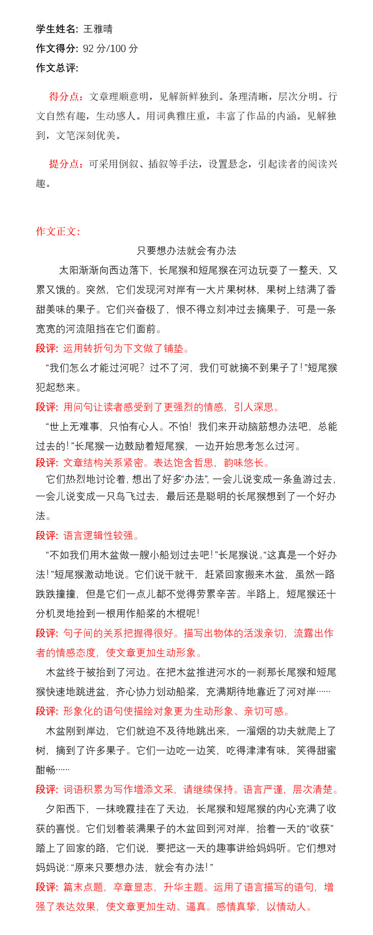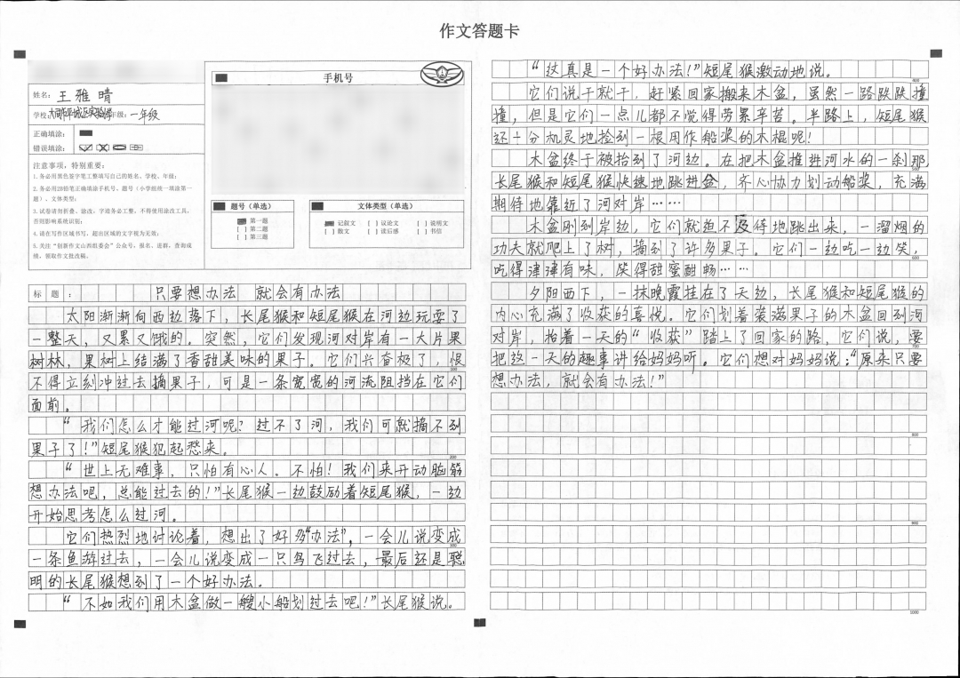 一直以来,她对语言文字都较为敏感,所以识字量较大,可以自主阅读。每每读到喜欢的书就爱不释手,这也使她在写作时更加思维敏捷、思路清晰、主旨鲜明。作为家长,我希望她永远保持这份热爱和坚持,就像她的作文题目一样,只要想办法,就会有办法,不畏困难,勇往直前,拥有自信乐观的美好品质。