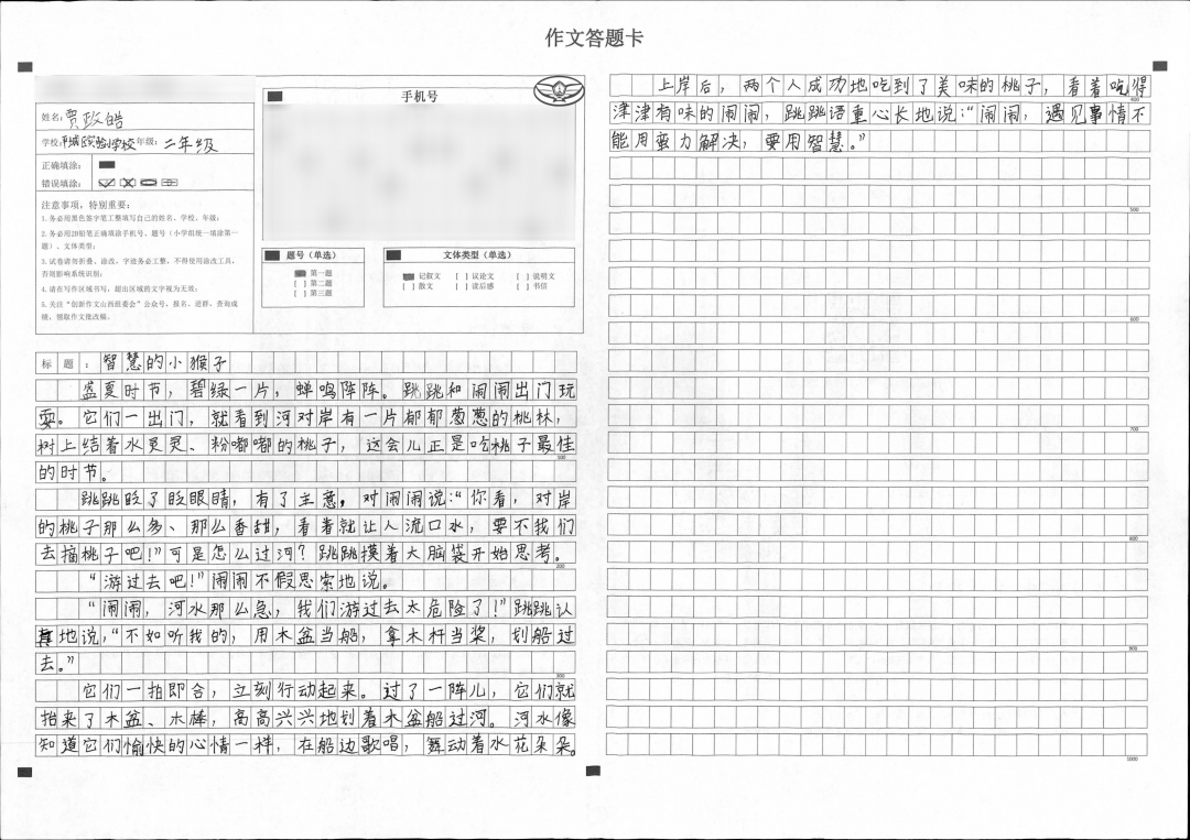 本篇文章主体以对话方式展开,恰当运用修辞方法和优美词语,让文中小猴子形象鲜活灵动。主题明确,结构清晰,展示出小朋友处理事情的机智和显见的安全意识。