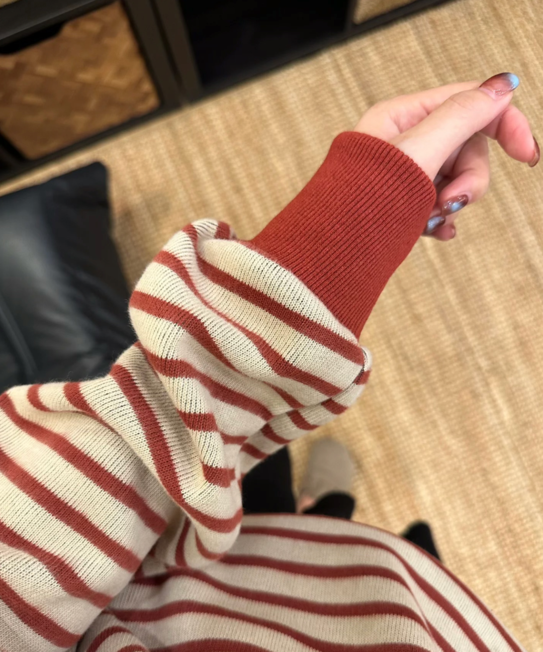它加长袖口拉长了手臂线条,粗手臂藏进去显手腕细,穿脱外套不臃肿~