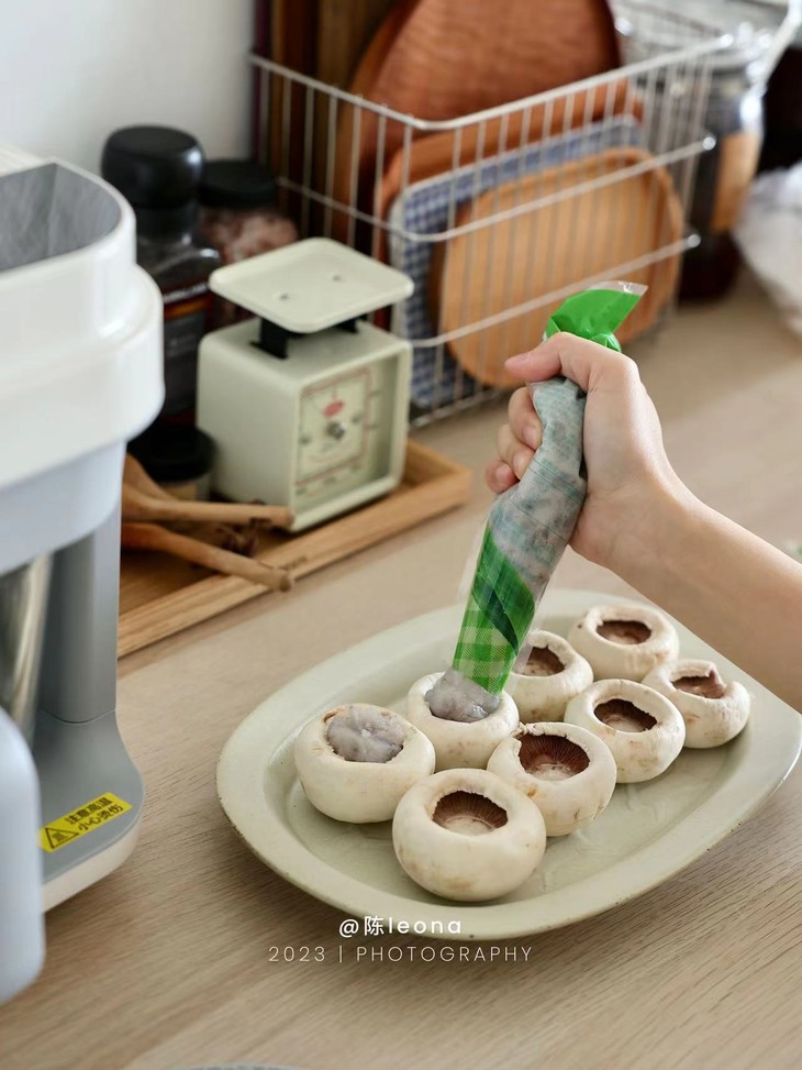 2、将虾滑挤满口蘑,顶上放上一小块黄油