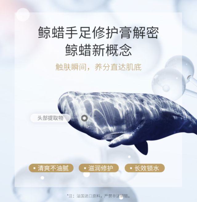 鲸蜡:为鲸目鲸科抹香鲸,以鲸骨腔中油质之固形成份,精制后入药。(oiu小黑盖修复霜为法国进口原料,严禁非法捕鲸)