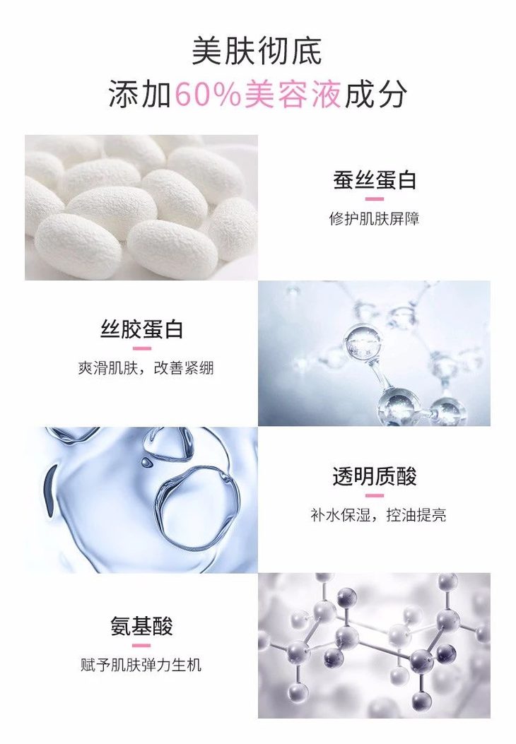 添加60%美容液,美肤更彻底;添加丝胶蛋白,缓解洗后紧绷干燥肌肤更水弹;胶原蛋白GL,胶原蛋白美容液成分令肌肤饱满弹力;氨基酸导体,保湿补水,微小氨基酸份子使肌肤更易吸收;微米泡沫,泡沫细腻丰富,深入肌肤纹理,清爽洗净污垢。