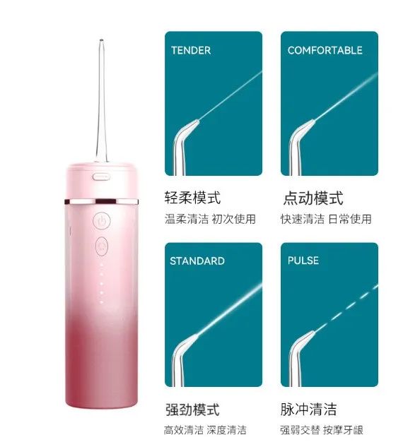 轻柔模式:水流柔和,适合口腔敏感和初次使用人群。 点动模式:力度略强,适合平日中午晚上深入清洁口腔,满足大家日常需求。 脉冲模式:强弱交替,对牙龈起到按摩效果,对牙龈出血人群特别友好。 强劲模式:高效清洁,深度清洁牙缝顽固污垢。