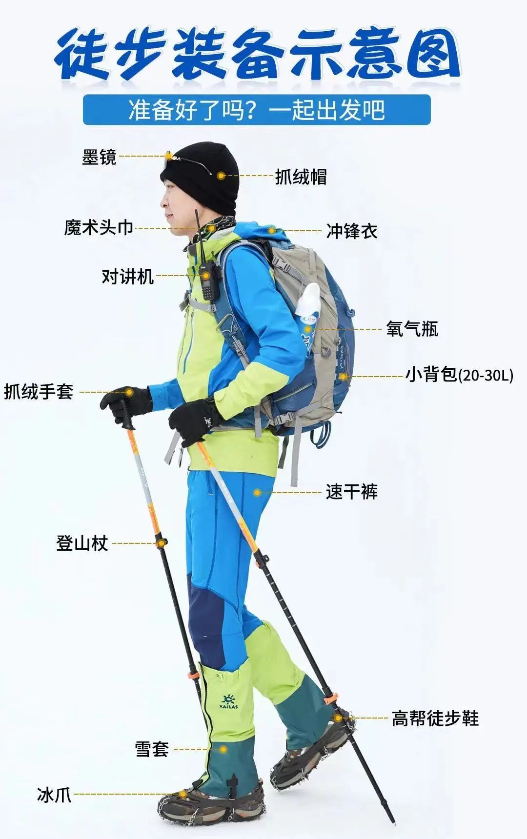 标准是两根登山杖(根据地形选择是否携带),正确使用双仗可以降低30%体能消耗,降低对膝关节22%的压力。