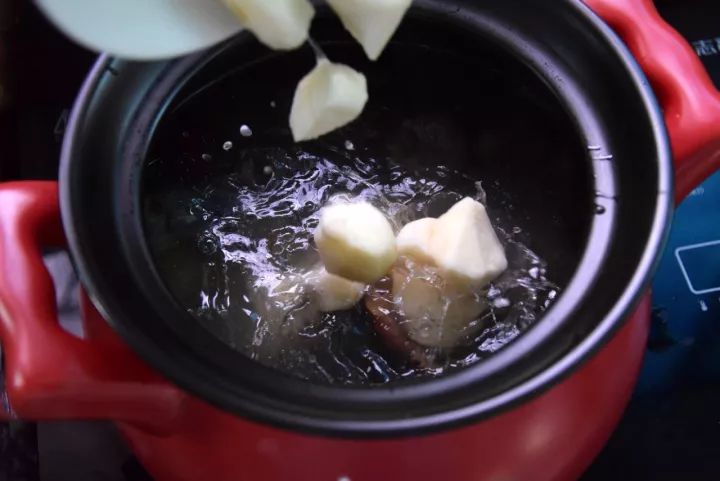 砂锅中入约1800ml,放入焯过的乌鸡,加入姜和红枣。