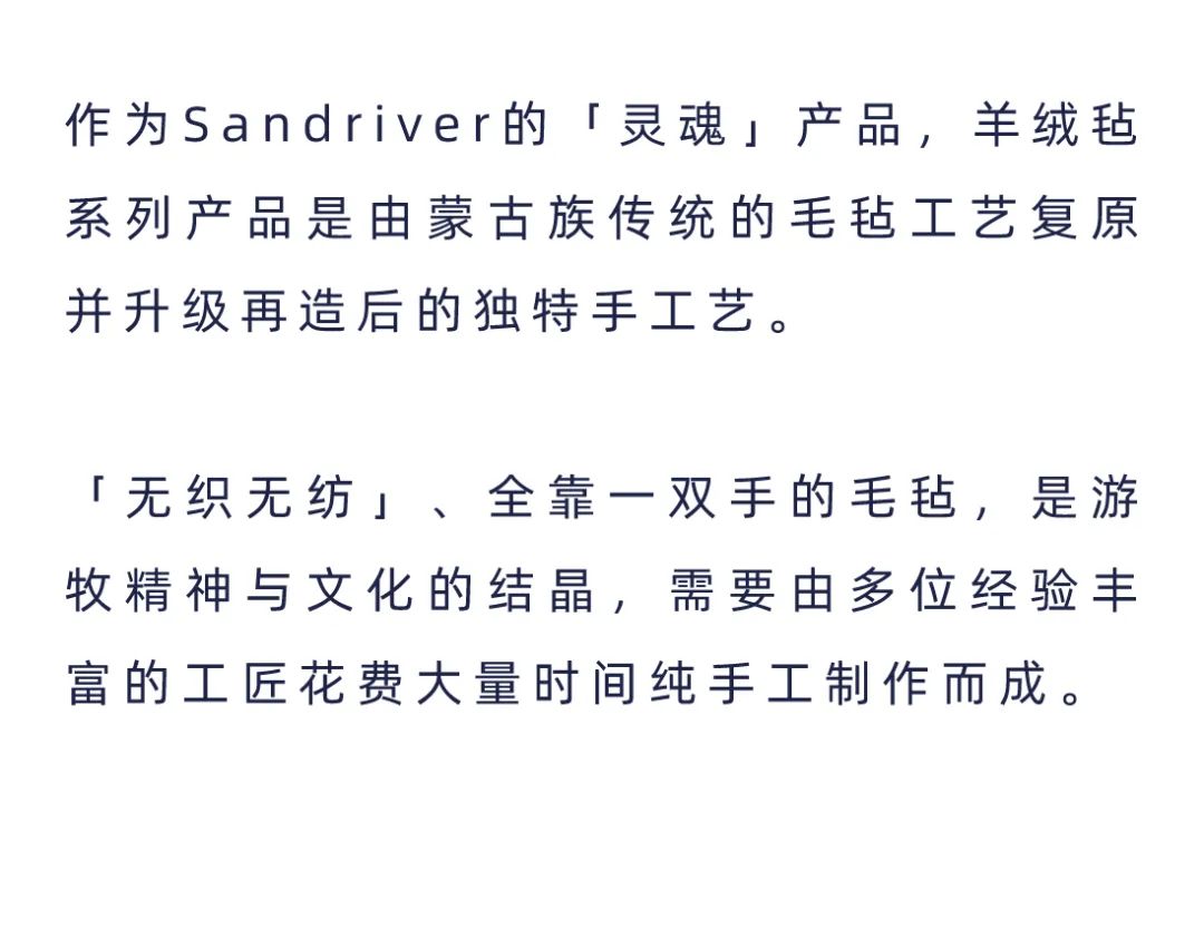 历年在巴黎时装周亮相,享誉世界的艺术羊绒品牌[Sandriver 沙涓]由羊绒布道者郭秀玲女士创立。阿拉善自有牧场纯种羔羊绒,日本国宝设计师小筱顺子,上海自有基地精工细作。承载羊绒情怀,坚持匠人品质。