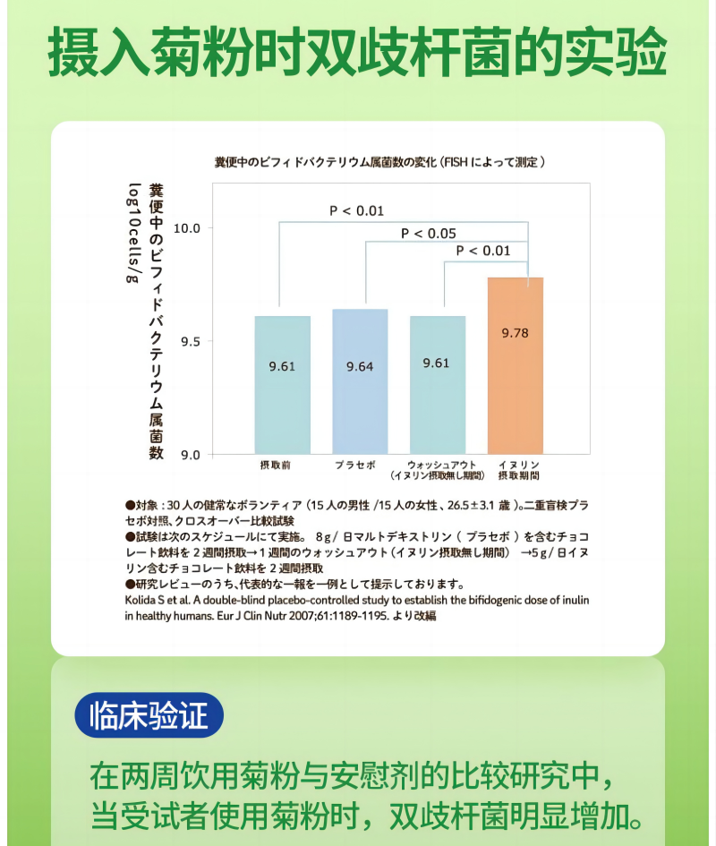 其中含有90%+高纯专 利菊粉,能比以往的水溶性食物纤维更 好的增 殖长双歧杆菌,壮大肠道内的“苗条菌”的数量,打败体内坏菌,还能通过菌群调整我们的胃口;