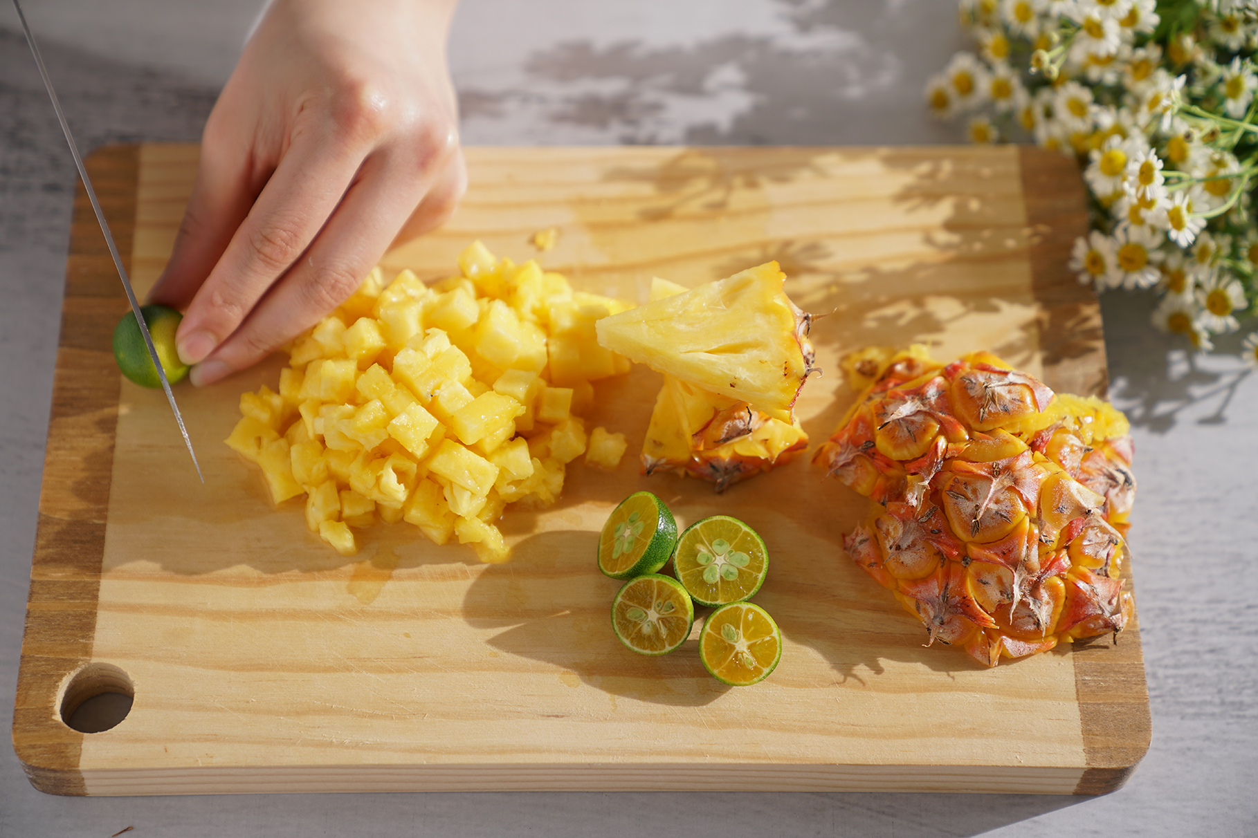1.凤梨切几块三角形小块留作装饰用,其余去皮切成小粒,小青柠对半切开;