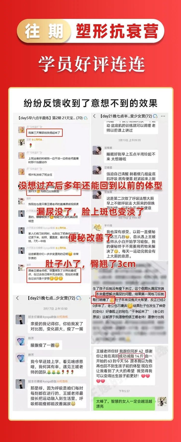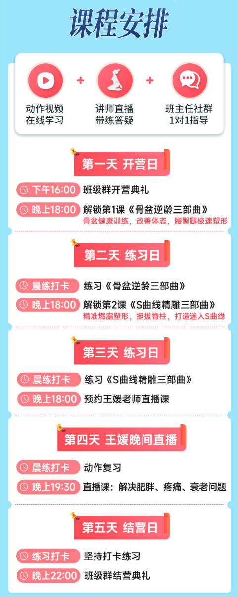 一套100%针对骨盆,集合变瘦+变美+抗衰于一体的瑜伽; 名师王媛真人直播答疑+带练(明星的同款教学体验); 1V1的瑜伽指导,搭建友爱社群,及时为你答疑解惑,纠正动作;