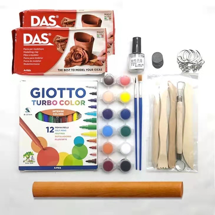 包含: 白泥1000克、赤褐泥1000克、泥塑工具5件套、12色Giotto彩笔、12色丙烯颜料、2支画刷、10ml亮油、钥匙扣10个、小磁铁5个
