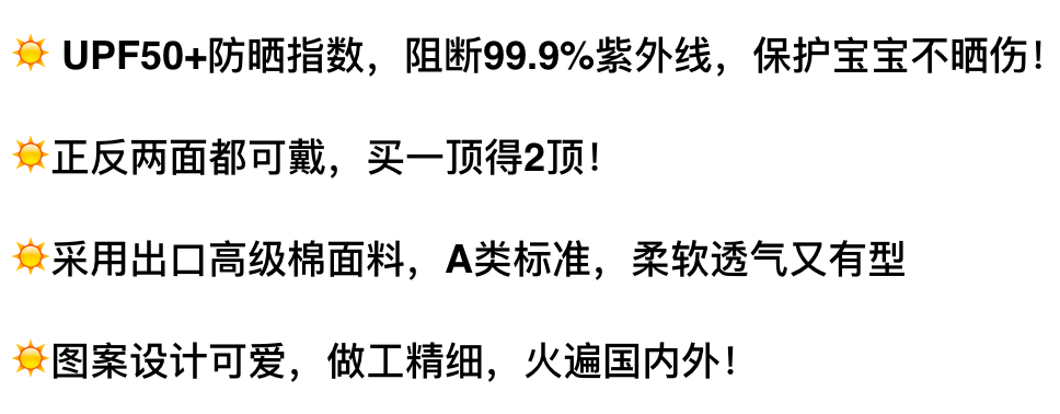 这次一共两款型号,双面防晒帽+3D造型棒球防晒帽。问品牌要了诚意开团价,了解的妈妈直接团,款式选择也多,趁号全就下手啦~