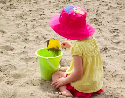 即使娃专心在暴晒的海边挖沙也能阻挡住大部分紫外线~