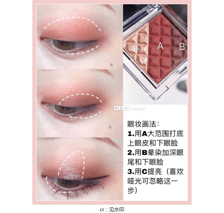 三色眼影呢,其实就是在双色的基础上增加了一个提亮或者更重的颜色,可以让整个眼睛的层次感更丰富。