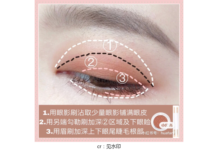 画法比较适合新手,简单又不容易出错,用眼影刷蘸取眼影轻扫在眼窝处就万事大吉辽。