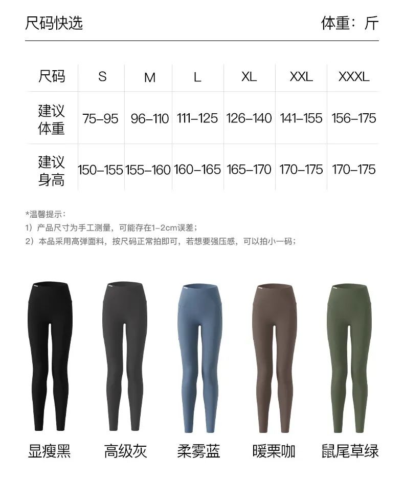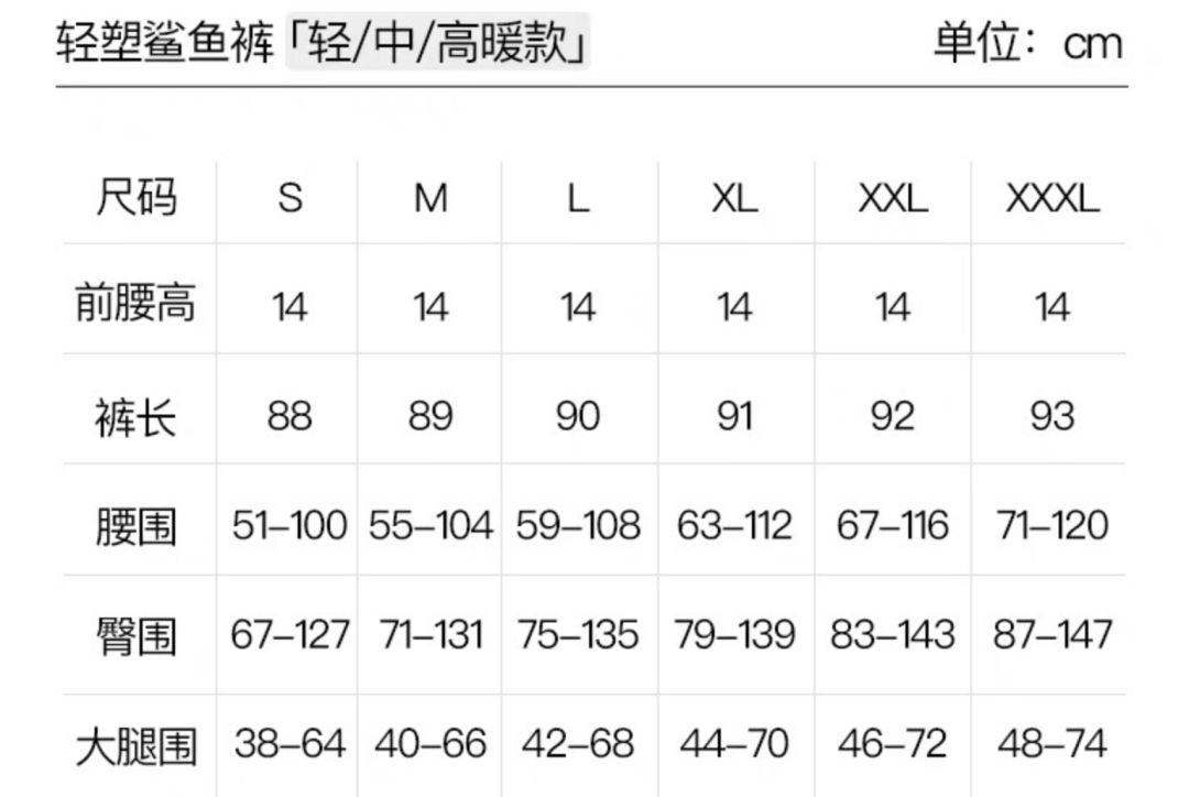 以下尺码对应轻/中/高暖,精确到裤长、腰围、臀围、大腿围、贴身选择适合自己的尺码更舒服。