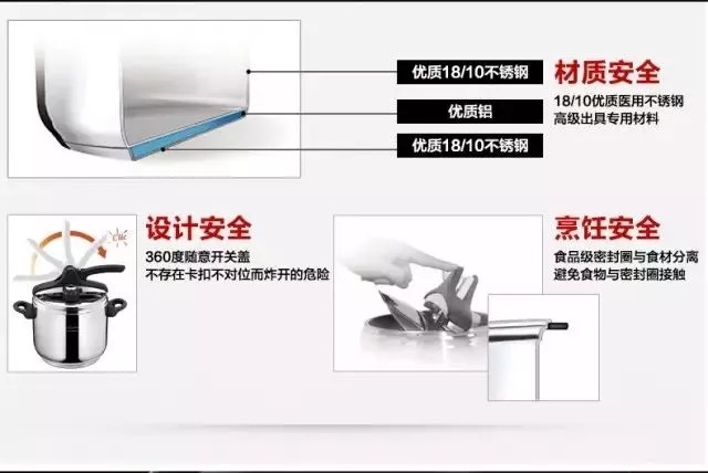 即使所有的安全装置都失效,锅盖只会变回波浪型,掉进锅里。完全不会像之前传统的高压锅一出事,锅盖就一飞冲天,所以上市50年来没有一例安全事故。这是第一重安全。
