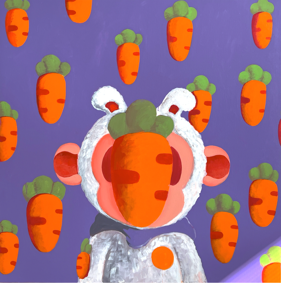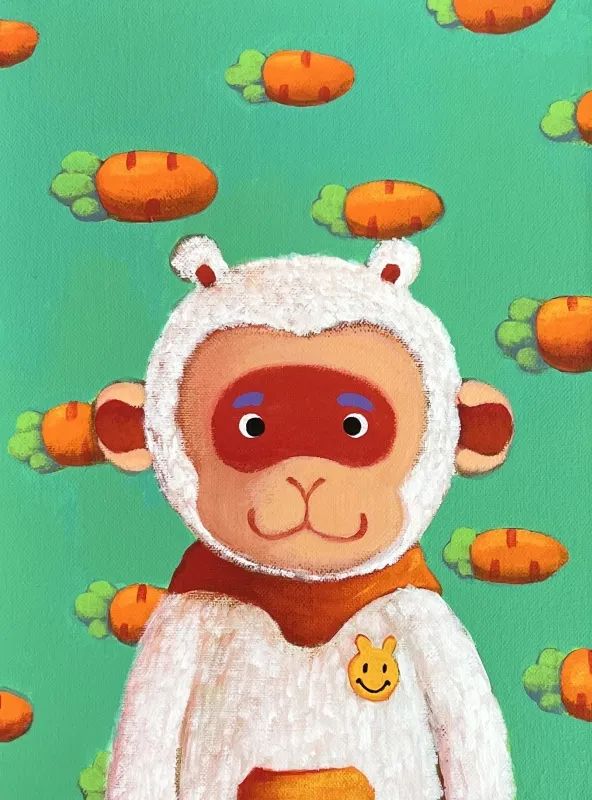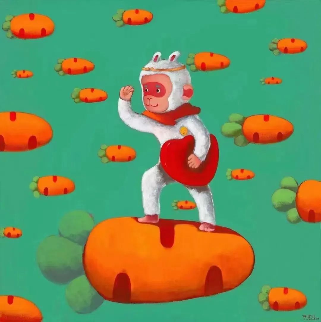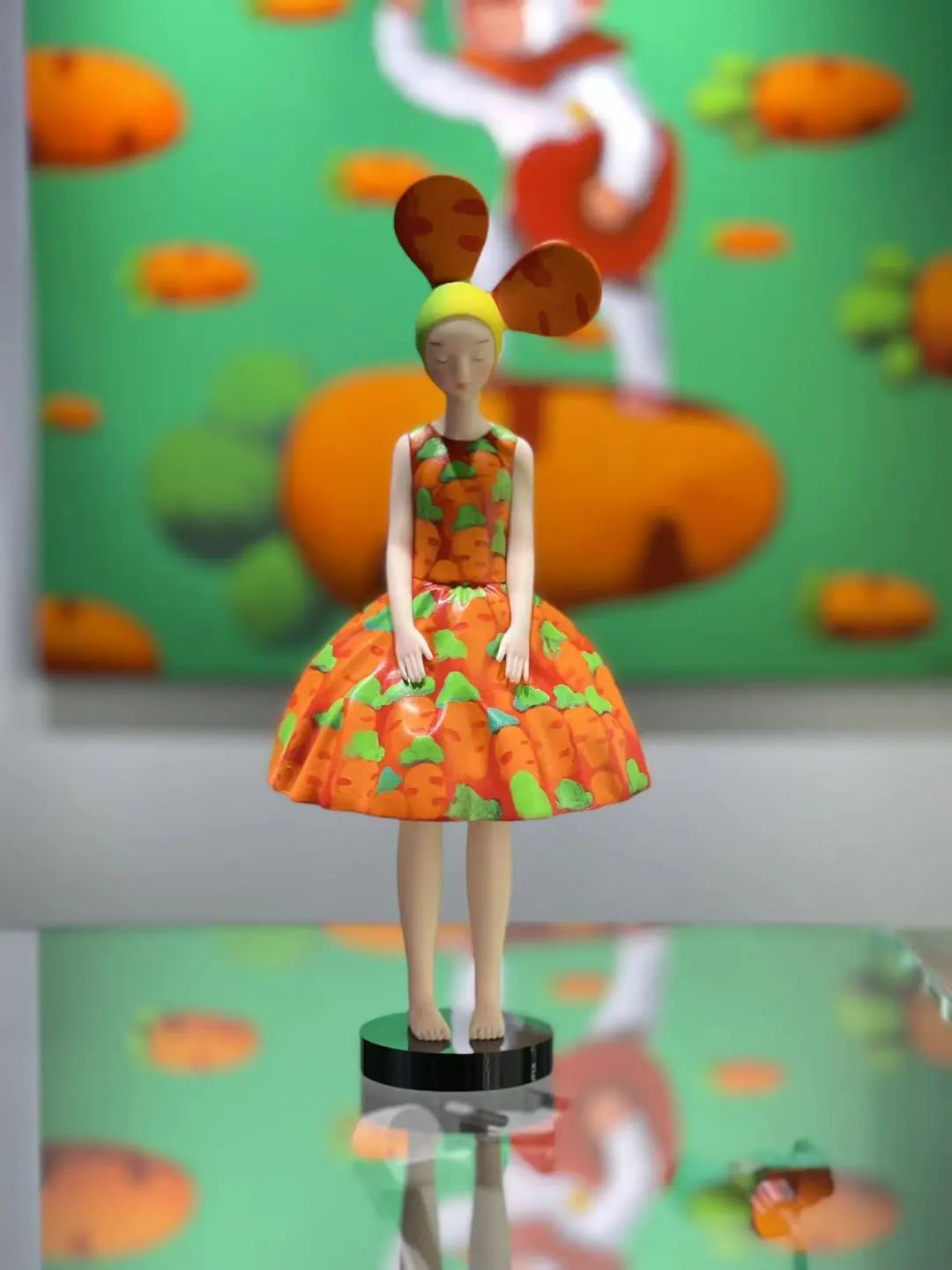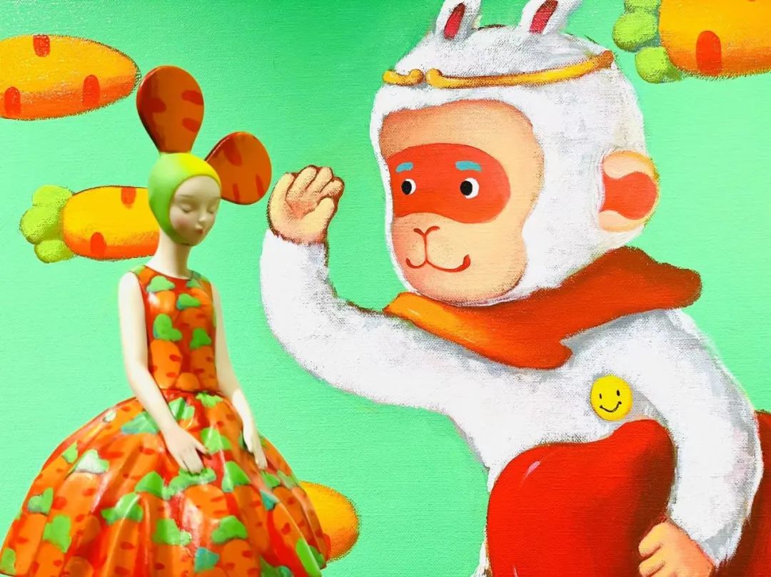 这是艺术家陈建周为此次个展「兔」飞猛进创作的然女孩。萝卜是艺术家心中孙悟空幻化的产物,他也希望这个萝卜能保护着然女孩,也是保护着每个女孩心中的那份纯真与童心。