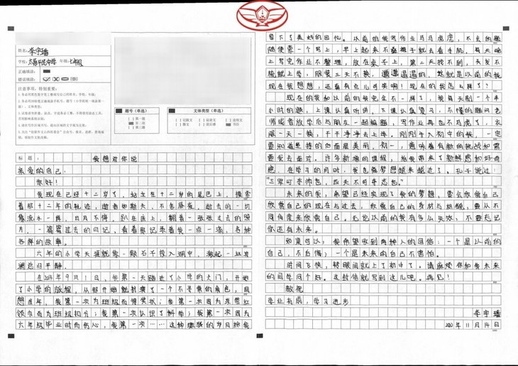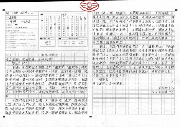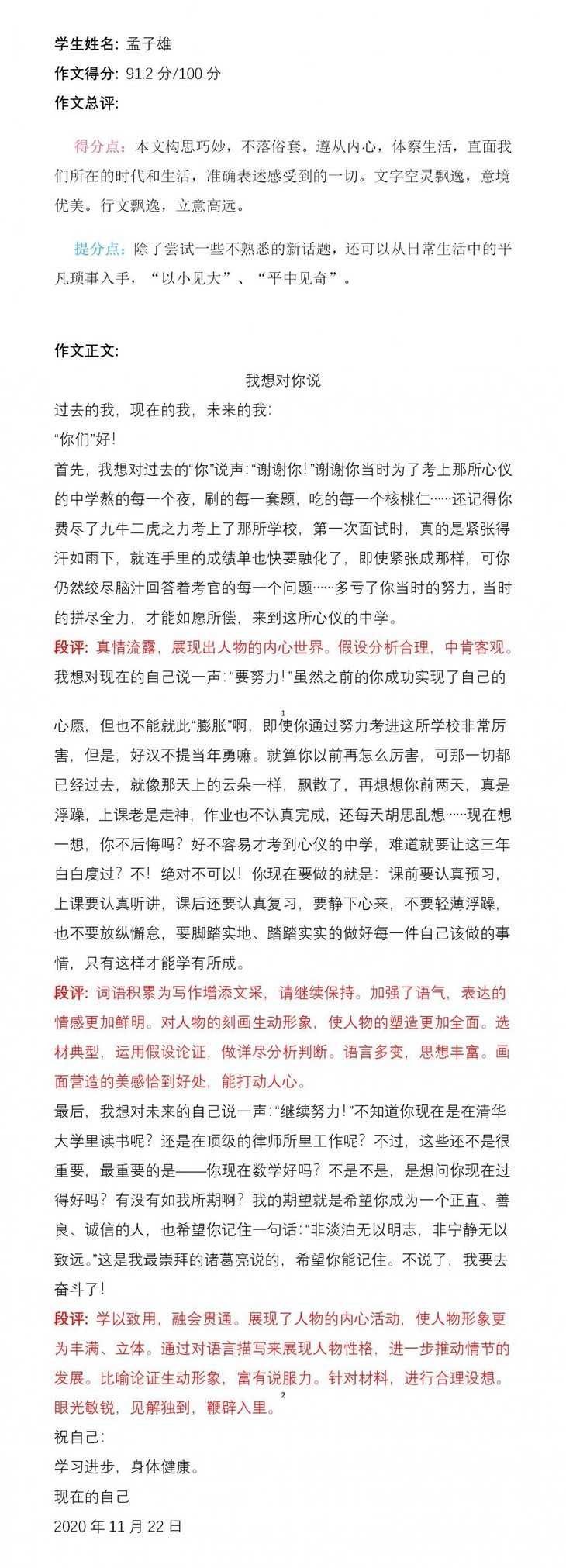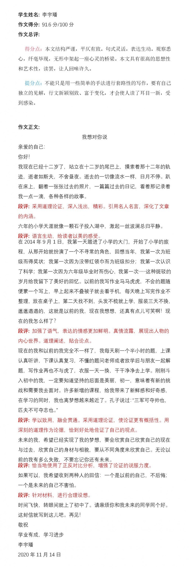 家长:生命如水,岁月如歌。如同叔本华所说:“人生的每个阶段都是成长”,正视过去,珍惜现在,规划未来才是对生活最好的回应。《给自己的一封信》,孩子的这篇文章,将信分别写给了过去、现在和未来三个“自己”,语言流畅,感情真挚,构思巧妙,生动具体,自然通达。希望他能像文章中的自己一样,在反思中不断进步,向着自己的人生理想继续努力!