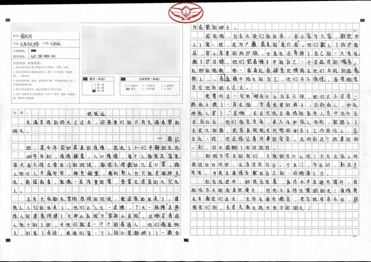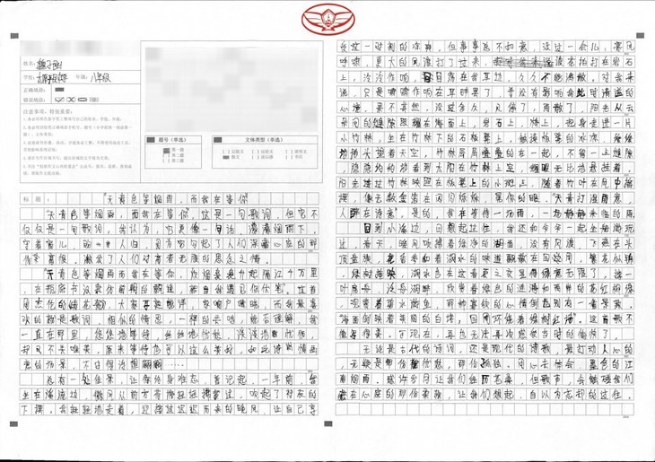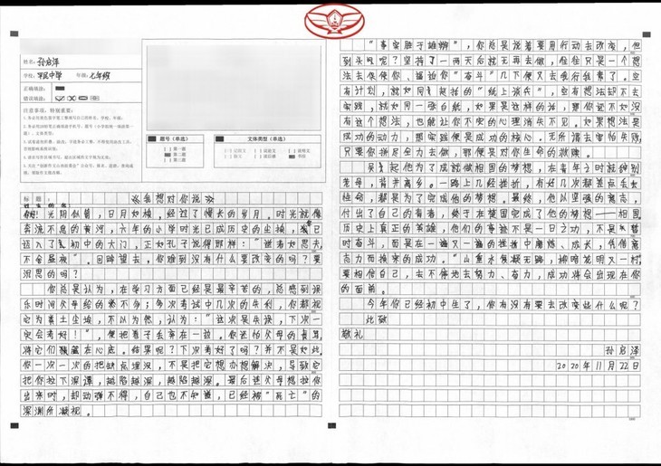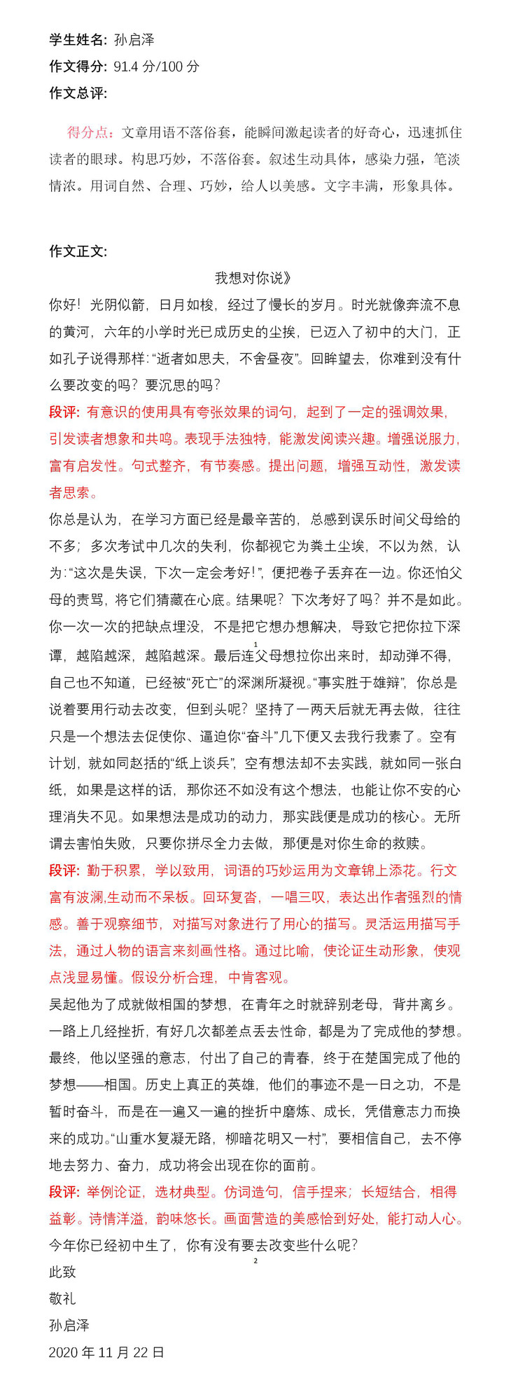 生活中,孙启泽就是一位朴实寂静的孩子,但总见其捕捉动心之处的慧眼和浅浅的微笑。本文书写工整清晰,布局匀称,符合书信的格式要求,更可贵的是其文章于平淡中见真情。文笔流畅,娓娓道来,对自己的认识,审思,期待的真实情感流淌在字里行间,写来不急不徐,让我们看到了真情比语言、比技巧更可贵的文章,真的是文如其人,期冀他能在作文创作的道路上越走越宽、越走越远……