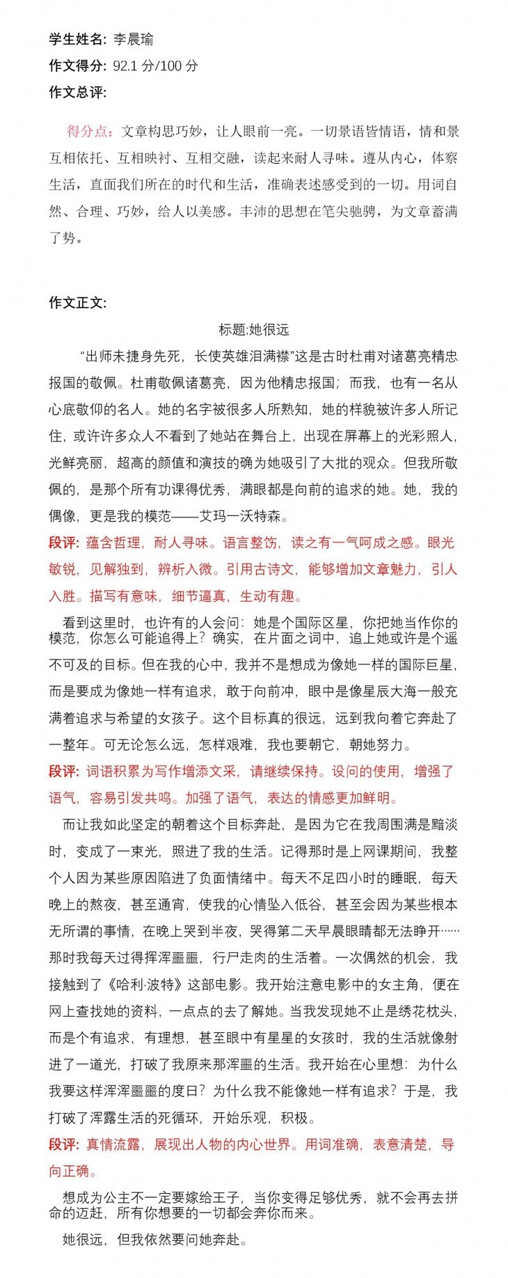 大家好,我是来自太原平民中学1901班的李晨瑜 ,今天来跟大家分享一下我的参赛作文《她很远》写作心得 。本文我以艾玛·沃特森自己喜欢的国际明星为明线, 构成了一篇励志 、追梦的作文 。我是在寒假时期接触到《哈利·波特》这部电影的 ,从此也接触到了艾玛沃特森这个女演员。 在我的眼中 ,她是很完美的一个女性: 有学习、 有身材 、有颜值。 但是她让我所真正敬佩的,是她往前冲的勇气和她无限的可能,她曾经也经历过很多的挫折 。但是每一次她都靠自己的勇气和信心 ,挺过了一道道难关。 在寒假期间我整个人的情绪和心情都不是很好 ,都处于一种低落的状态 。我们把这个某种时期的情绪低落称作“低谷期”。 在这段时间中, 线上的考试里, 我遇到了很多的挫折: 考试成绩退步、 排名退步、 甚至上网课的时候上课的状态也都不是很好。 面对父母老师和同学的质疑 ,导致我的心情更加的低落。 但是在我接触到艾玛沃特森之后, 我就发现并不是每一个人的一生都是顺顺利利的, 总有人要经历挫折, 只不过差别在于有些人经历了挫折之后就失败了 ,而有些人靠自己的勇气信心和毅力毅然决然的往前走。 我就定去学习像艾玛沃特森一样勇敢的去追梦,勇敢的往前走。 不再去顾及生活中的挫折。 所谓失败是成功之母, 不失败哪来的成功呢 ?所以当我拿到作文的三个题目时 ,我一眼就看到了“她很远”这个词。 的确,艾玛沃特森确实离我很远, 她是一名国际巨星, 而我只是一名普通的初中学生。 但是我也得像她一样 ,有信心有勇气往前走。 所以就有感而发,写下了《她很远》这篇作文。