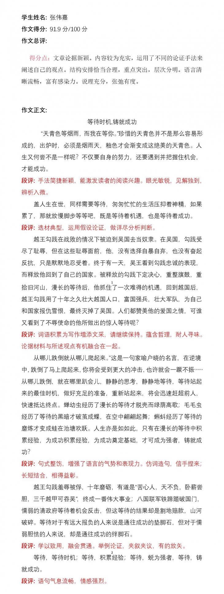 聪明伶俐,灵动活泼的伟嘉,总是能在关键时刻爆发出巨大的能量,展现出不俗的风采。文章展现了你敏锐的眼光,独到的见解。文章论据充分,论证有力。娴熟地运用议论文的写作手法,充满哲思。老师相信你一定能抓住机遇,把它变成美好的未来!