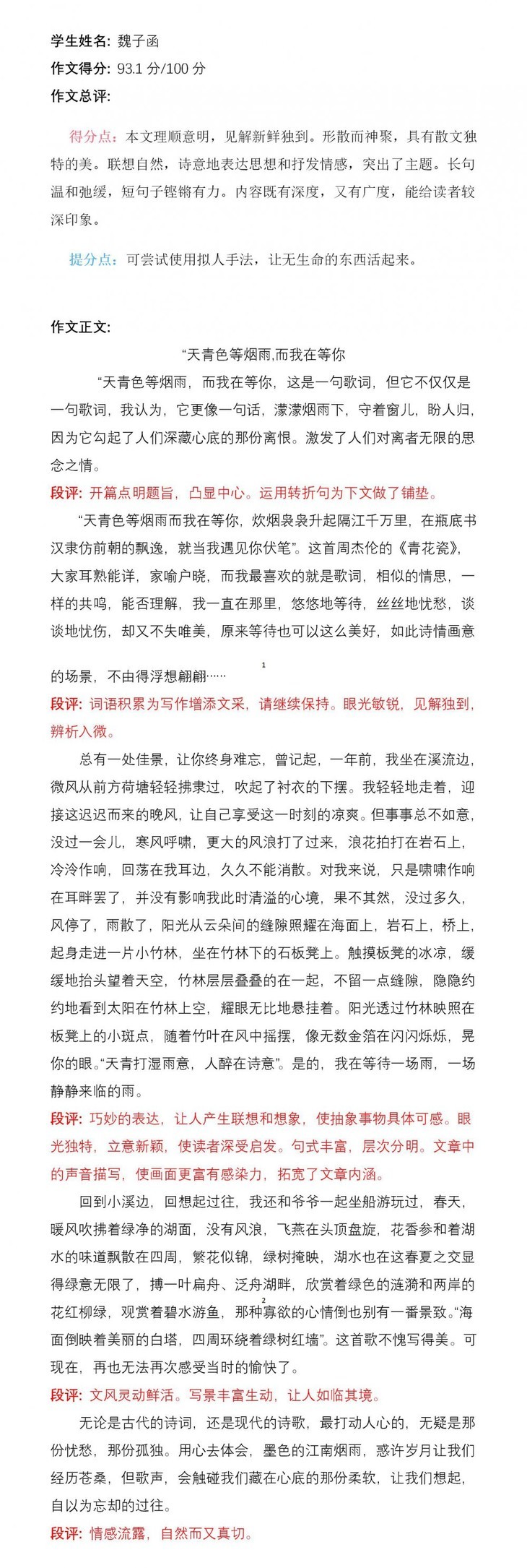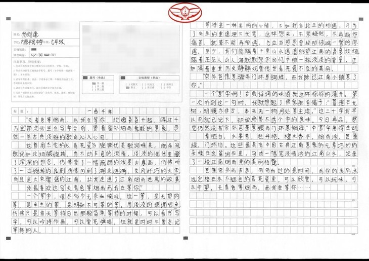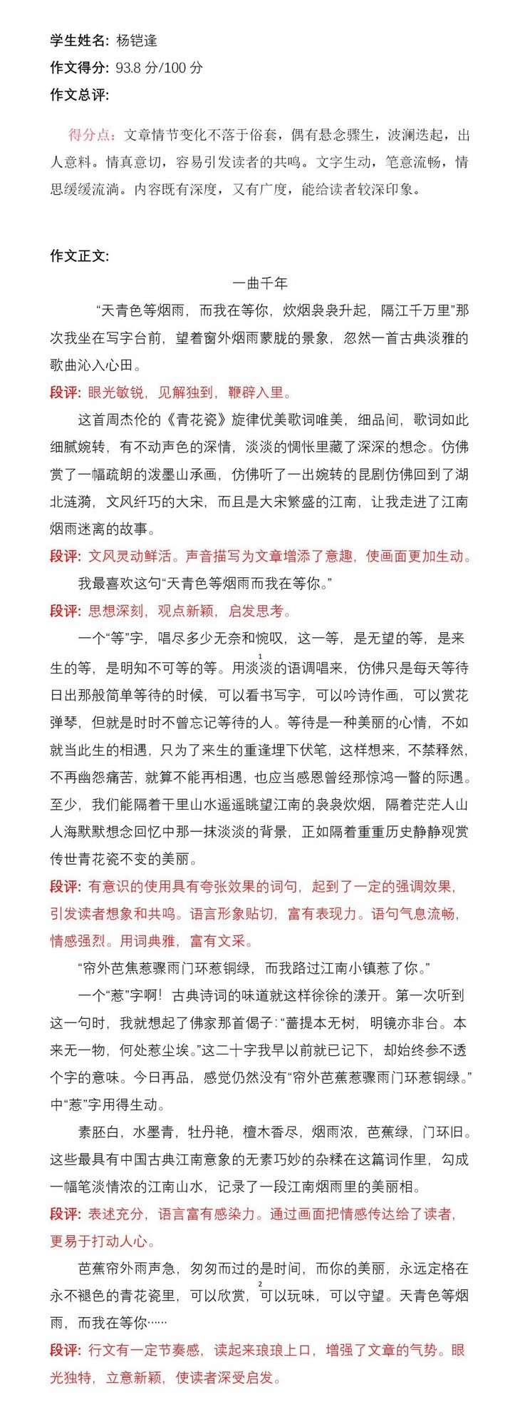 凯逢同学热爱生活,喜欢文学。此次参赛作文将这首浓郁的中国古典韵味的歌曲融入笔端,文笔细腻情感丰富,文章紧扣一个“惹”字和“等”字,宛如一幅江南烟雨水墨丹青画,又仿佛听到一段缠绵悠远的故事,淡淡的忧愁浸润在字里行间,读来让人回味无穷!