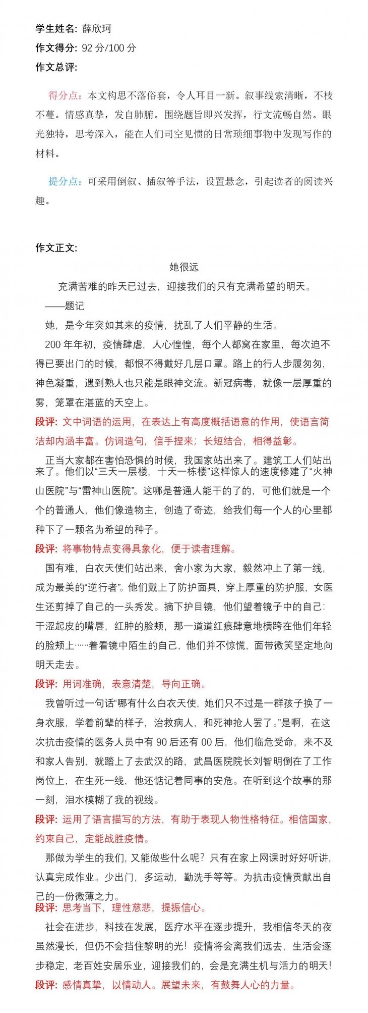 欣珂是一个很优秀的孩子,在平时也很注意生活的点滴积累,尤其是此次新冠疫情以来,欣珂能够自觉自律的加入抗击疫情的队伍中来,从“她很远”这个题目中能够获得创作灵感,她——“新冠疫情”当时在我国内肆虐,通过我们大家的携手努力,终将会离我们大家的生活渐行渐远,迎接我们的,会是充满生机与活力的明天。人人都可以成为自己的幸运建筑师,老师愿你在未来前行的道路上,用自己智慧的大脑去规划自己的人生,用自己勤劳的双手搭建通往成功的桥梁,让自己走向成功,走向幸福。