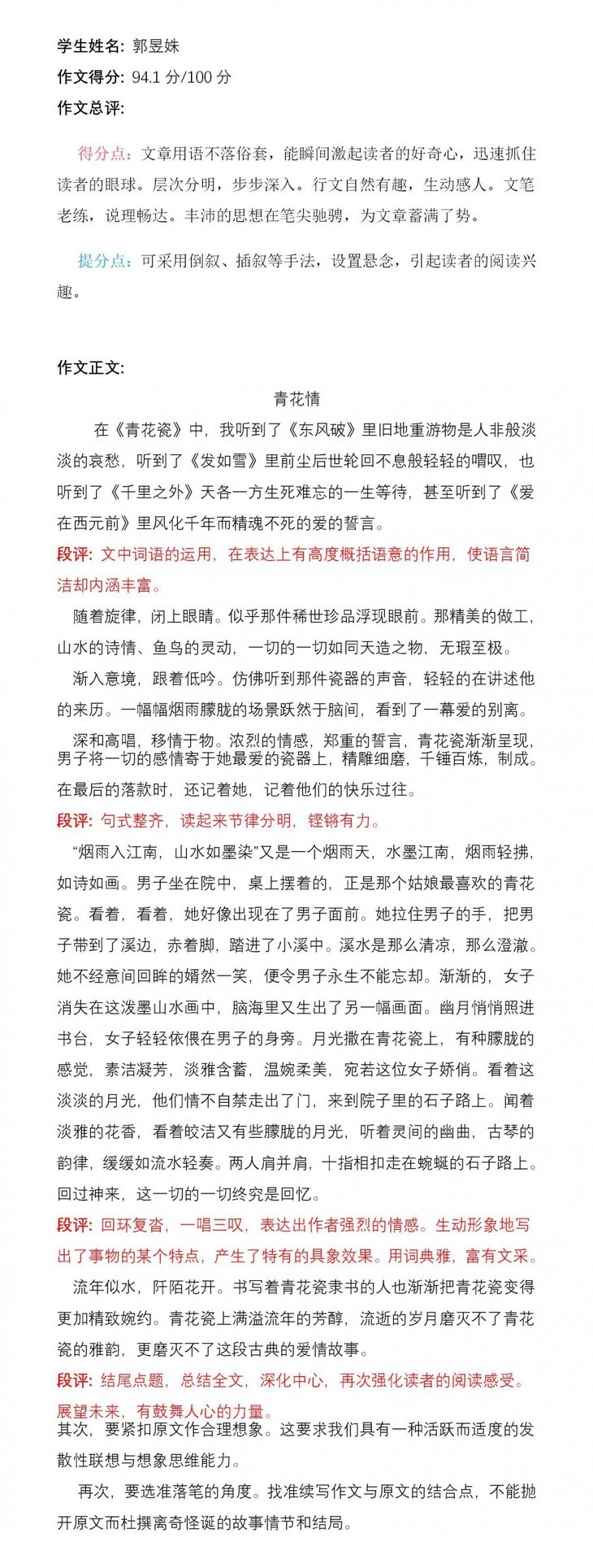 郭昱姝同学是一个感情非常细腻的孩子,她对一切事物都很感兴趣,尤其是对青花瓷,更是情有独钟。小学时期张口就来的便是周杰伦的《青花瓷》,唱得那么投入。到了初中,对青花瓷有了更深层次的理解,加上平时不断的积累,因而写出了此次文章。希望郭昱姝再接再厉,在文学以及其他科目上有更高的造诣。加油宝贝,你是最棒的!
