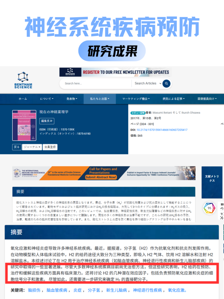 《Bentham Science》一篇日本研究指出,分子氢在预防和治疗神经系统疾病方面具有显著潜力。通过抗氧化应激和炎症的细胞信号分子,氢有望成为治疗脑损伤、脑血管疾病等的有效手段。