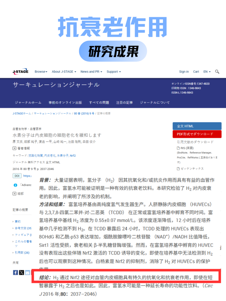 《STAGE》一项日本研究表明,氢对血管内皮细胞具有持久的抗氧化和抗衰老作用。即使在短暂暴露于氢之后,这种保护作用依然存在,显示出氢在延缓衰老过程中的潜力。