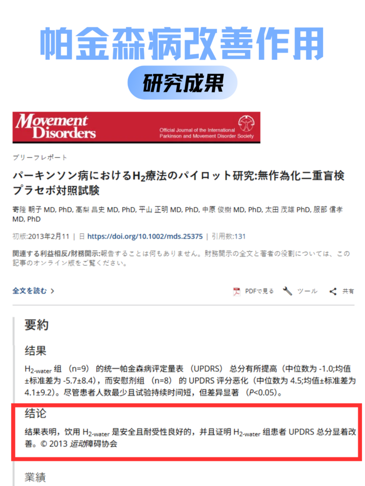 《Movement Disorders》一项日本研究显示,氢对帕金森病患者的统一帕金森病评定量表(UPDRS)总分有显著改善。为氢在帕金森病治疗中的应用提供了新的希望。