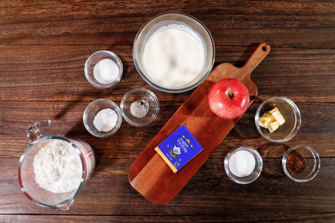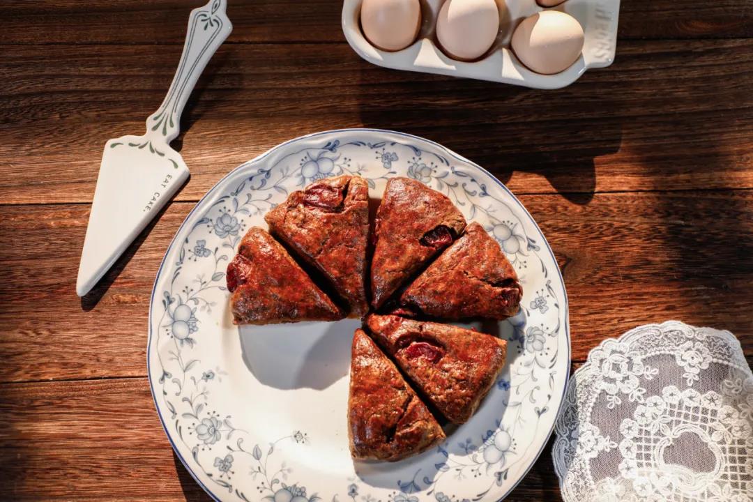 [3]混合低粉、红茶粉、砂糖、盐和泡打粉。加入淡奶油和焦糖苹果粒(连同黄油一起),切拌成团。