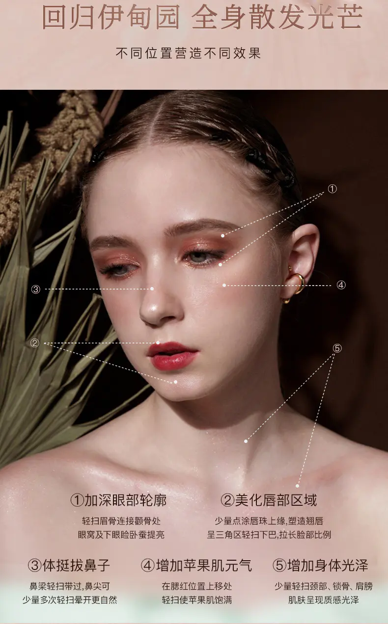 🌟1. 圣光——暖色调带细闪全脸适用,可点涂于眉骨,下巴,鼻尖,填泪沟,带来水光肌肤感觉
