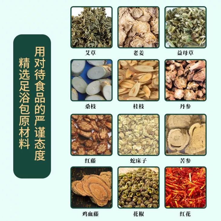 「草本足浴包」以艾草为主料,搭老姜、益母草、桑枝、桂枝、丹参、红藤、蛇床子、苦参、鸡血藤、花椒、红花等多味草本,配方比例经过多次调整,相辅相成,以达到更好的驱寒、温经通络的效果!