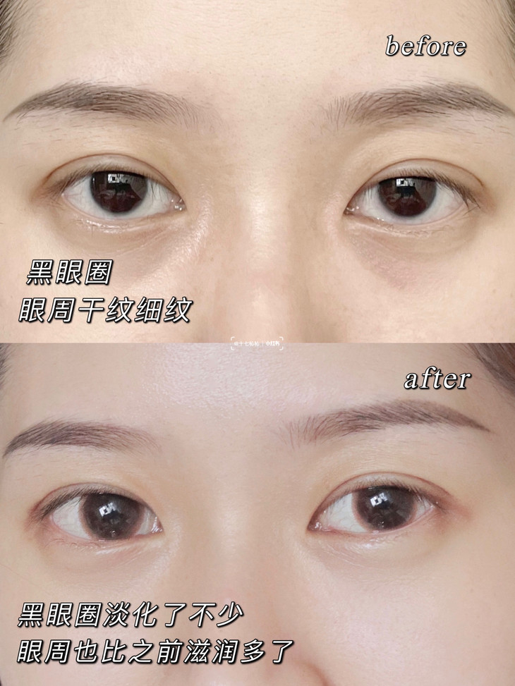 效果可以说是肉眼可见, 黑眼圈小细纹都淡了很多,像平时卸妆不仔细造成的眼周暗沉也提亮了不少~