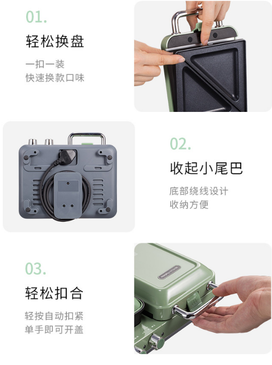 烤盘是可拆卸的,可换成华夫饼盘、平煎盘……等等。