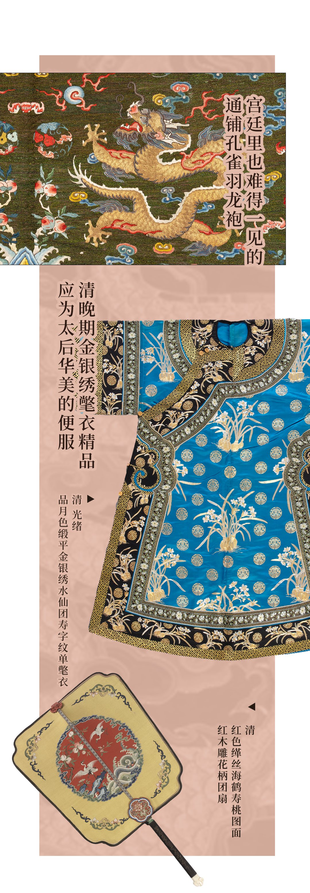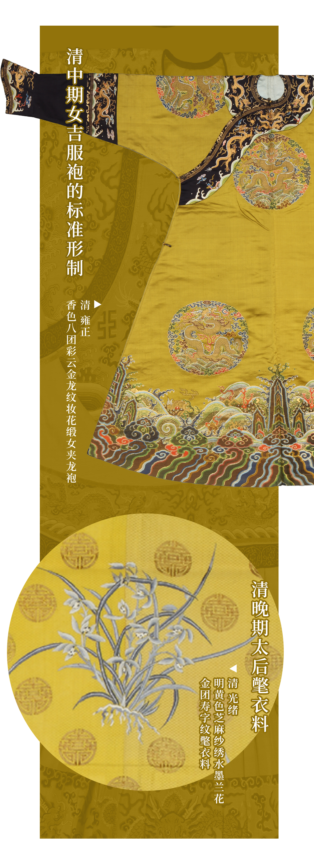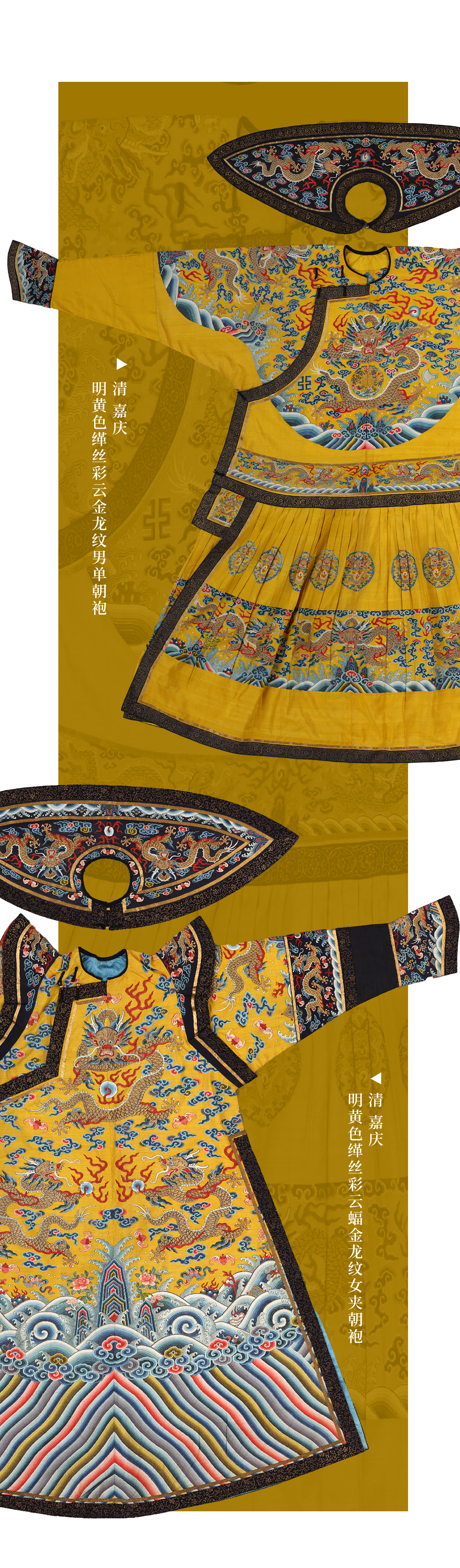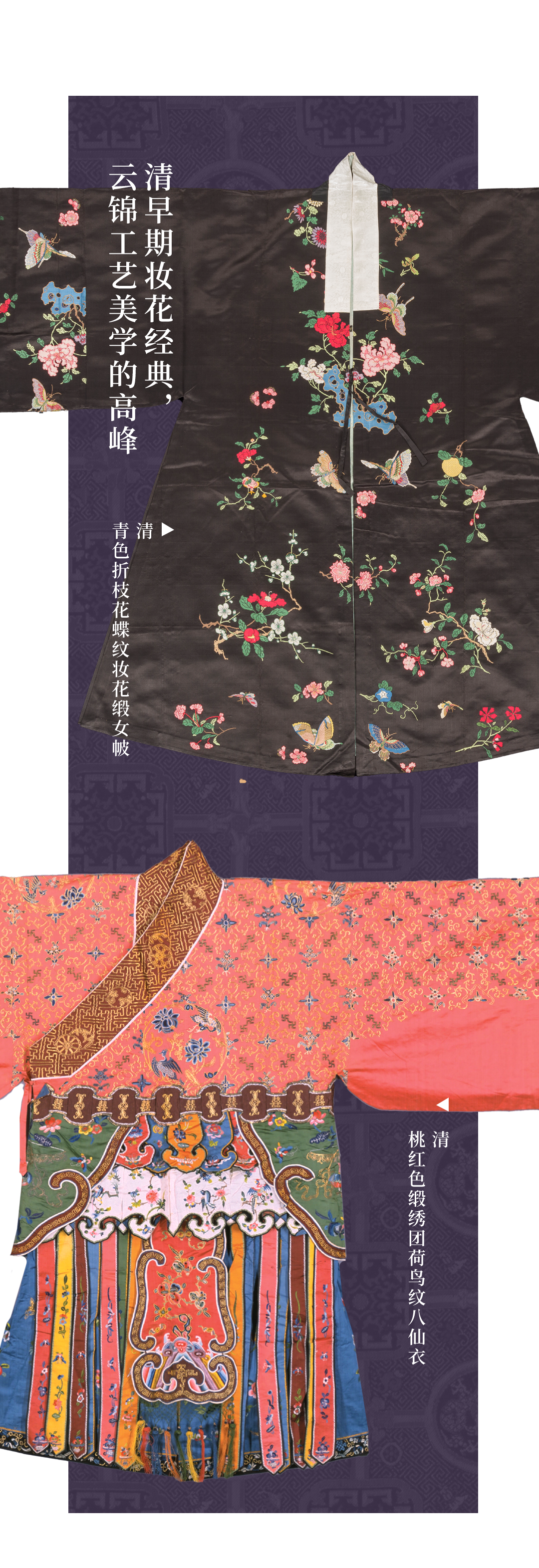 衣裳有色,章纹有彩。在织物上呈现多彩的图案,通常有染织、刺绣、印染和笔绘四种工艺,清宫彩服上都有应用。而传统服装以多彩的锦、绣工艺最为贵重。清代,多重组织的锦在服装上高贵地位被妆花织物和缂丝工艺取代,而刺绣也是宫廷服饰纹彩最主要的工艺载体。