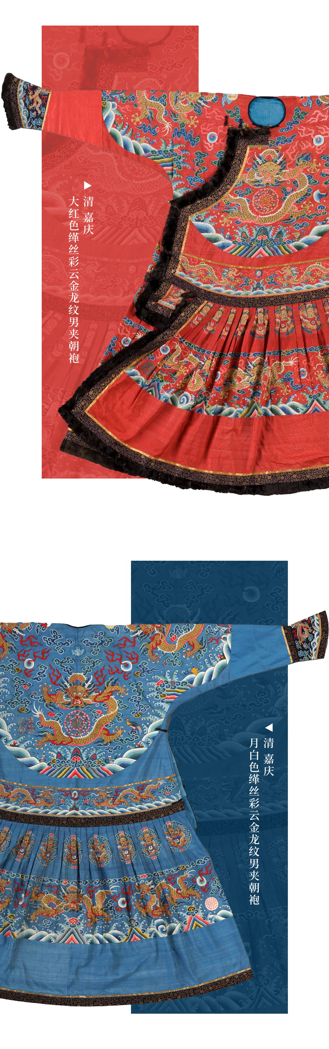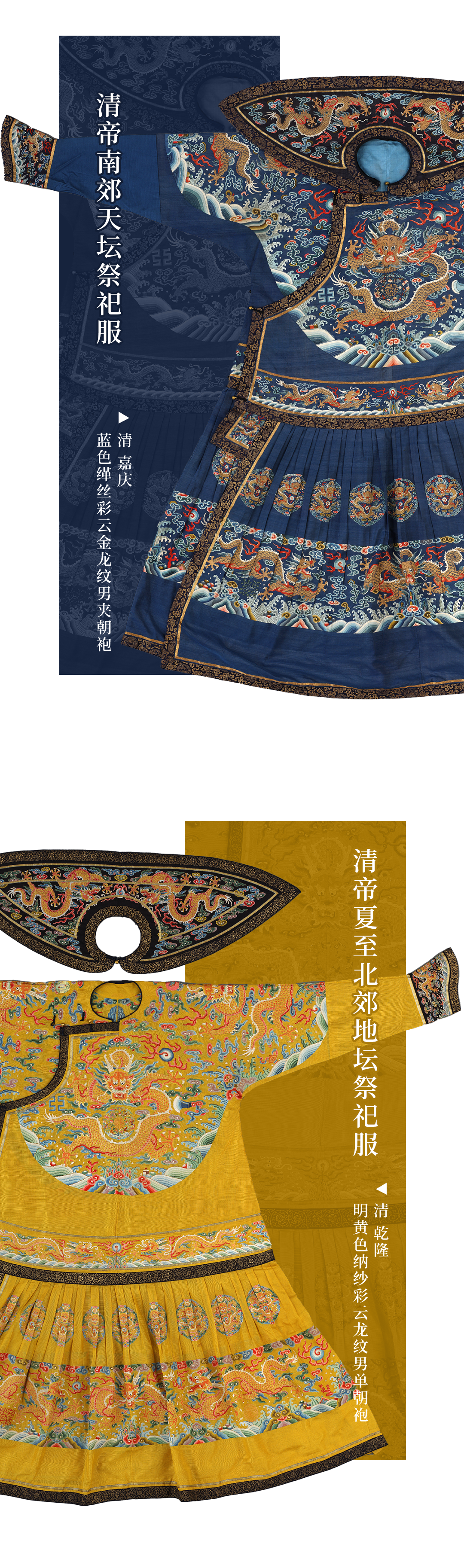 天子之职,莫大于礼。国之大事,莫大于祀。礼服、祭服,由草创而至盛世,五色备而求礼之隆。在古代君权神授的观念下,承天命,治万民,君主治国也是对天命负责,明君对于祭祀都诚敬惟谨,祭服也是宫廷中制作最精良庄严的服饰。因此染色、织绣标准也非常严格,不许有一点疏忽和瑕疵。