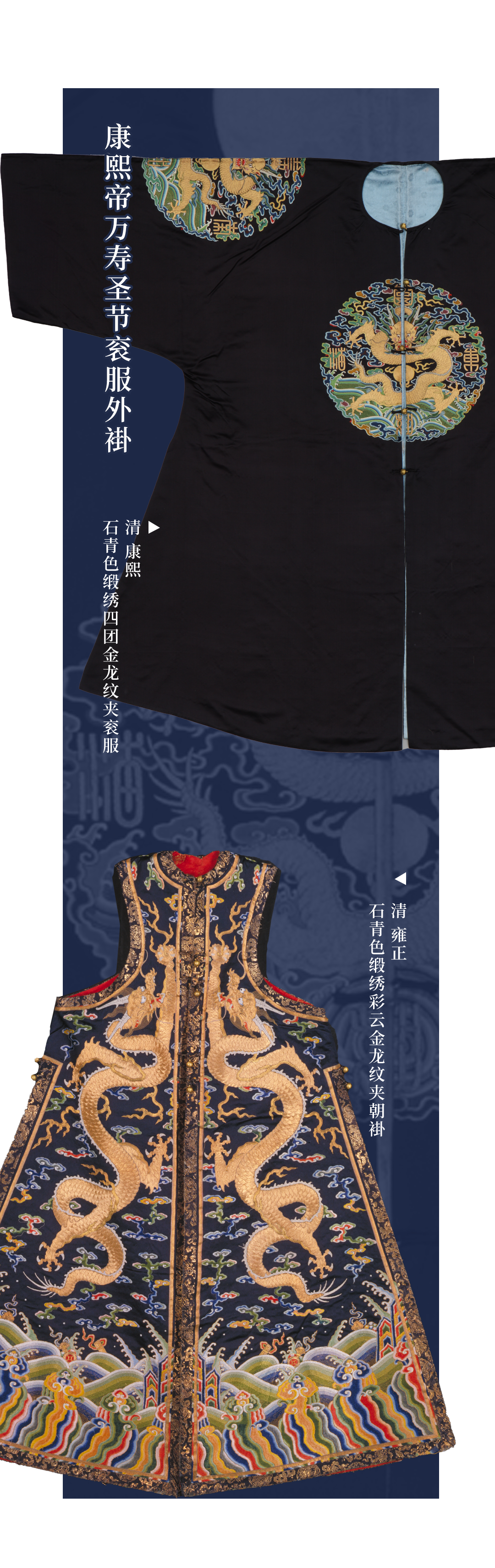自康熙、雍正时期,清宫中衣色礼制进一步明定。雍正朝会典更明确了四郊天、地、日、月坛祭祀的服色。而石青、明黄、宝蓝、大红、月白也是清代最重要的衣色和纹彩。